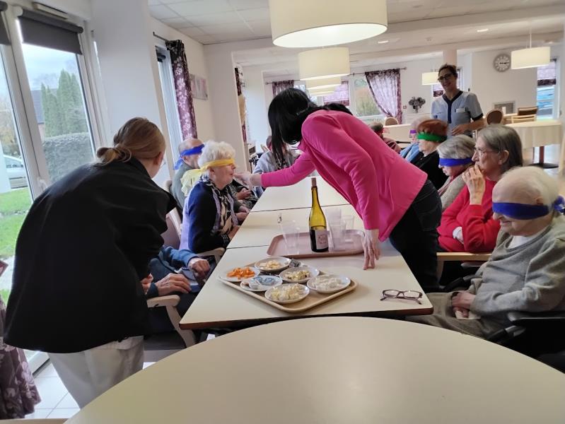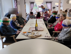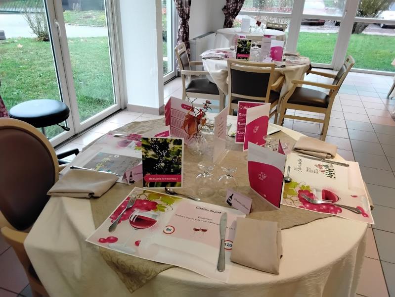 Pour fêter l'arrivée du Beaujolais, les cuisiniers de la résidence avaient concocté un repas parfaitement accordé à la thématique du jour : flammekueche, coq au vin, écrasé de pommes de terre, le tout accompagné de carottes à la persillade et d'une délicieuse poire au vin.