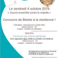 Publiée le 28/09/2019La résidence la Fontaine Médicis organise le vendredi 4 octobre un concours de belote au sein de la maison de retraite au profit de la lutte contre la maladie d'Alzheimer. Une participation de 3€ par joueur est demandée, et les fonds récoltés seront reversés à l'association France Alzheimer. La r&e [...] Lire la suite